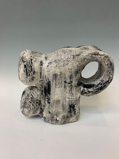 This sculpture explores the tension between structure and fluidity, using chicken wire as an armature to shape an organic yet abstract form. The layers of burlap and plaster add texture and depth, evoking a sense of weathered resilience. The monochromatic surface enhances the raw, tactile quality of the piece, inviting viewers to contemplate the interplay between materiality and movement, permanence and decay.